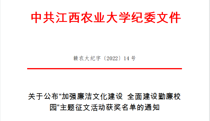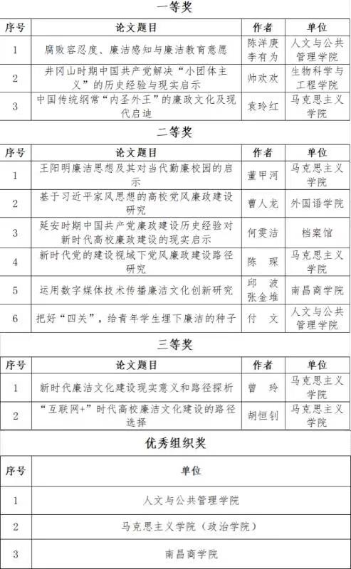 近日,校纪委公布了“加强廉洁文化建设 全面建设勤廉校园”主题征文活动获奖名单,学院袁玲红、董甲河、胡恒钊等三位老师分别获一、二、三等奖,2020级研究生陈琛、曾玲分别获二、三等奖,学院荣获优秀组织奖。