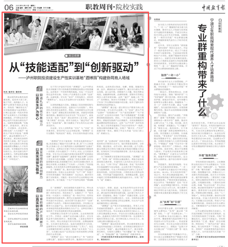 10月21日,《中国教育报》职教周刊·院校实践栏目专题报道我校创新性地建成集“实践教学、技能培训、真实生产、中试服务、活态传承、国际交流”六大功能于一体的生产性实训基地“酒博园”,构建真实生产、真实场景、真实转化协同作用的育人场域,推动人才培养从“技能适配”到“创新驱动”,为职业院校破解育人难题、服务产业升级提供了“泸职范式”。