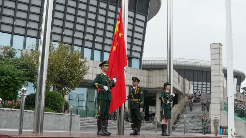 由受训新生组成的国旗方队,气宇轩昂地护送国旗来到升旗台前,五星红旗在庄严的国歌声中冉冉升起。