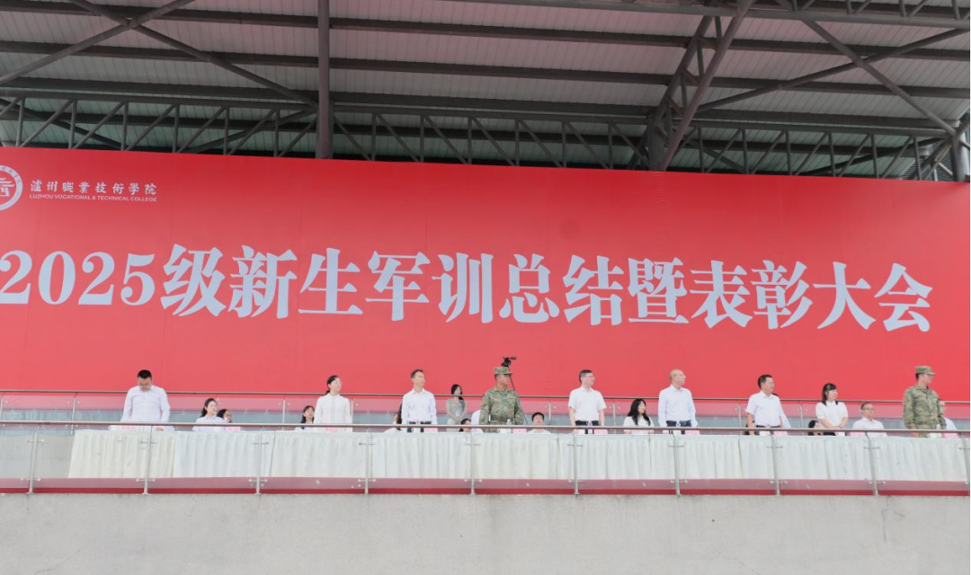 ▲何杰铿锵有力地宣布:泸州职业技术学院2025级新生军训结营!