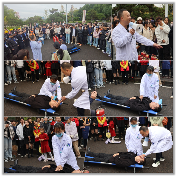 9时45分,进入实操培训环节。校园安保中队以“提、拔、握、压”四字口诀拆解灭火器操作步骤,演示防烟面罩佩戴要点。师生员工代表踊跃实操扑灭模拟火源,在场师生表示“亲手操作后,对初期火灾应对更有底气”。医疗急救培训现场,校医通过模拟伤员,详解止血包扎、心肺复苏(30:2按压通气比)等技能,师生分组实操掌握基础急救能力。