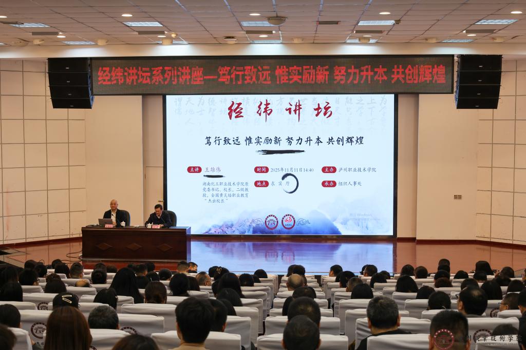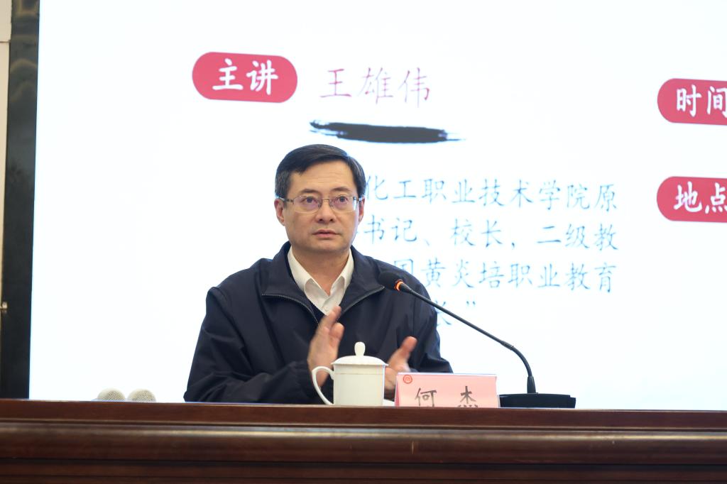 为深入贯彻新发展理念、构建新发展格局,全力推进学校国家“双高计划”建设提质增效,扎实攻坚职业本科院校创建目标,11月11日,全国黄炎培职业教育“杰出校长”,湖南化工职业技术学院原党委书记、校长王雄伟教授受邀莅临我校作“笃行致远 惟实励新 努力升本 共创辉煌”的专题讲座。讲座由党委书记何杰主持。